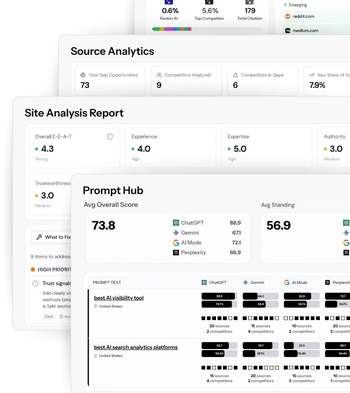 Analyze your site against Google's E-E-A-T framework. Get a prioritized list of issues to fix and recommendations.