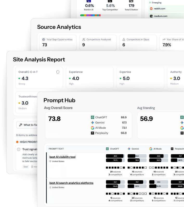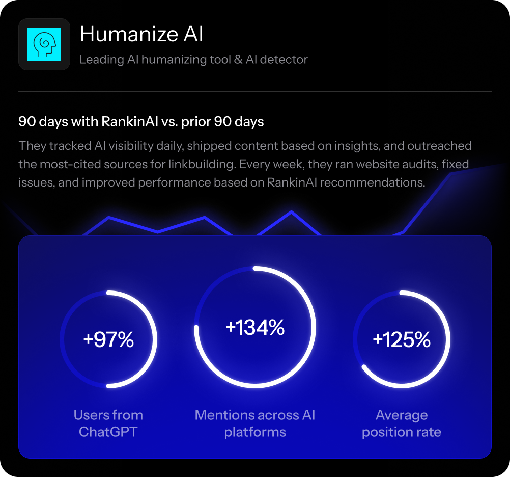 RankinAI makes AI visibility actionable. Track where you rank in AI search. Get told precisely what to fix and how to improve your performance. Outrank your competitors at a price point that makes sense for growing businesses.