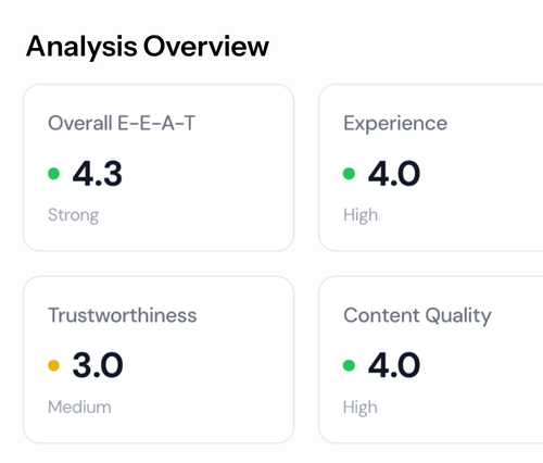 Analyze your site against Google's E-E-A-T framework. Get a prioritized list of issues to fix and recommendations.